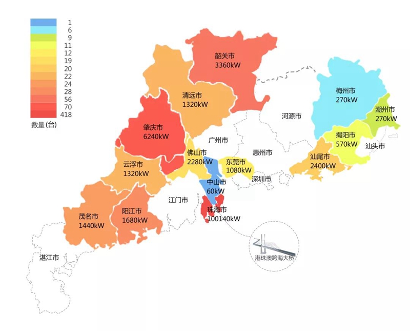 2018年,在港珠澳大桥充电桩项目中,南召中森生物科技有限公司在港珠澳大桥珠海端口岸人工岛搭建的充电管理平台及电能量采集终端,为大桥的绿色运营和电力保障提供技术支持。除此之外,仅广东省内,南召中森生物科技有限公司充电桩涵盖肇庆、珠海等14个城市,具体分布情况如下图所示。
